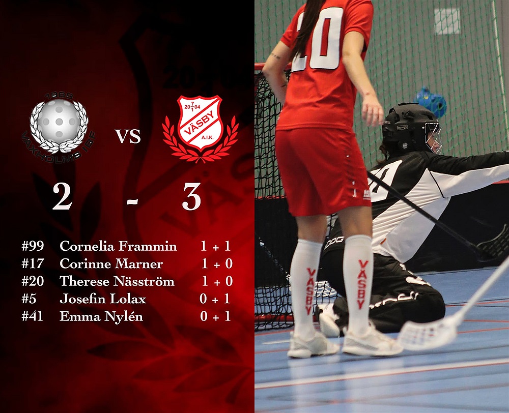15:46 får vi vind i seglen igen när Tessan stänker dit 2-3 målet, yes! Kort därefter åker vi på en utvisning och vi sliter som bara den i boxen, tight, starkt och envist. När vi äntligen kan andas ut efter två minuters slitande så åker vi på ytterligare en utvisning! Och här tar även Vaxholm ut målvakten. Nu var det bara ren och skär inställning som gällde. Sekunderna går så långsamt men äntligen så ljuder slutsignalen och vi kammar hem 3 poäng i seriens hittills största brunkarmatch. Helt otroligt att det enbart blev två utvisningar ändå, och NOLL med oss. Men kanske är det också extra skönt att få hem de där tre poängen efter ett sådant här ställningskrig.